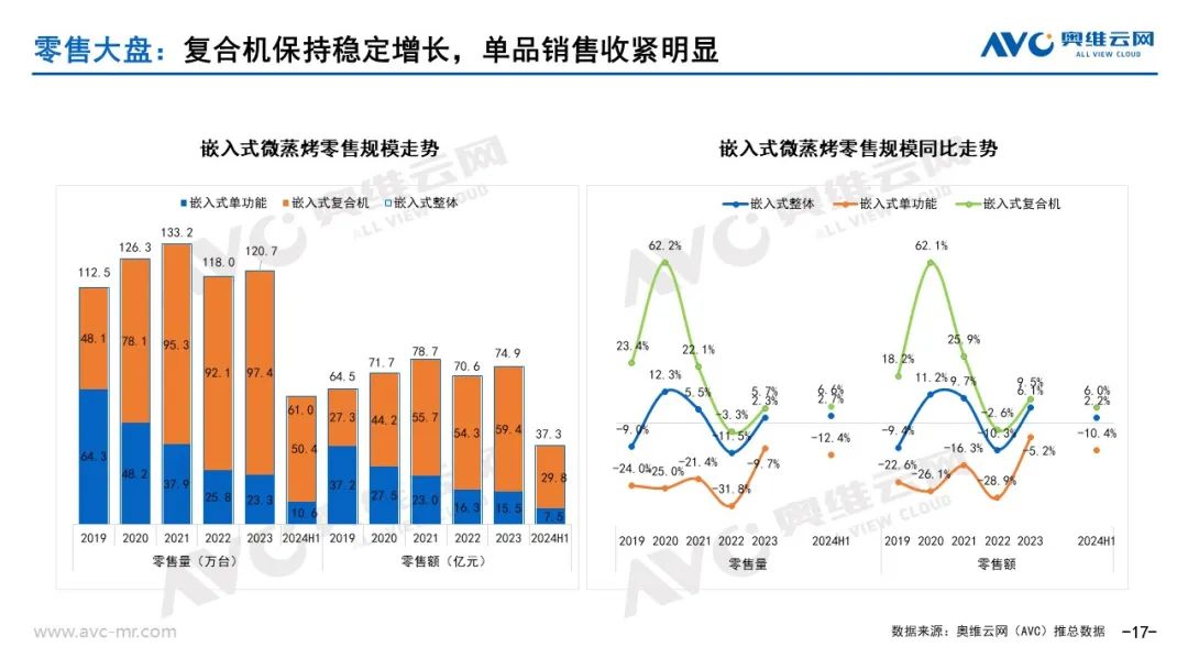 消费者对生活品质的要求不断提高,嵌入式微蒸烤产品以其美观、节省空间、性能优越等优势满足了消费者的品质改善需求。随着健康意识的增强,消费者对低脂、低油、低盐的清淡饮食越来越关注,而嵌入式微蒸烤产品通过无烟、低温慢煮等烹饪方式也更好地满足了这一需求。根据奥维云网(AVC)推总数据,2024年上半年嵌入式微蒸烤零售额37.3亿元,同比增长2.2%;分品类看,嵌入式单功能产品零售额7.5亿元,同比减少10.4%。嵌入式复合机产品零售额29.8亿元,同比增长6%。从销售结构来看,对于嵌入式微蒸烤产品目前还处于缓慢渗透阶段,消费者优先从无到有,随着产品技术创新的加强,价格逐渐的亲民化,嵌入式微蒸烤产品还有较大的增长空间。