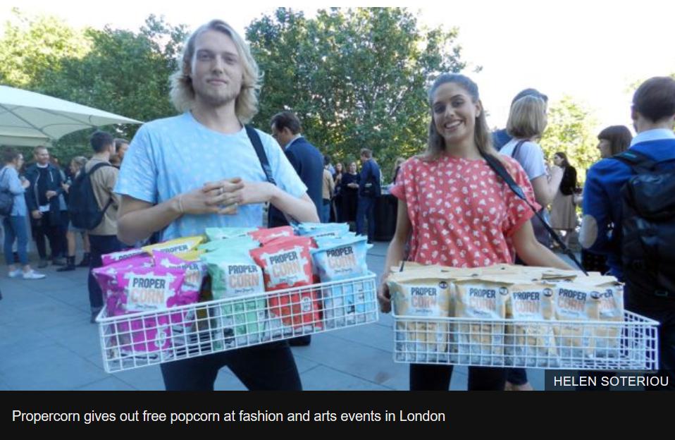 2016年深秋,去参加伦敦时尚周活动的人们完全不用担心他们会没有足够的零食供应,因为在人流最为密集的布鲁尔大街上,有那么一群面带微笑,热情洋溢的小伙伴,他们都是来自英国高端爆米花品牌Propercorn的工作人员。