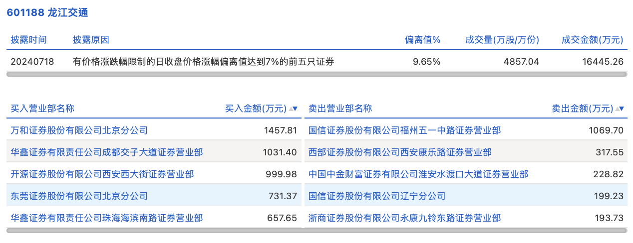7月18日,龙江交通今日涨停,龙虎榜数据显示,上榜营业部席位全天成交6887.23万元,占当日总成交金额比例为41.88%。其中,买入金额为4878.2万元,卖出金额为2009.03万元,合计净买入2869.17万元。