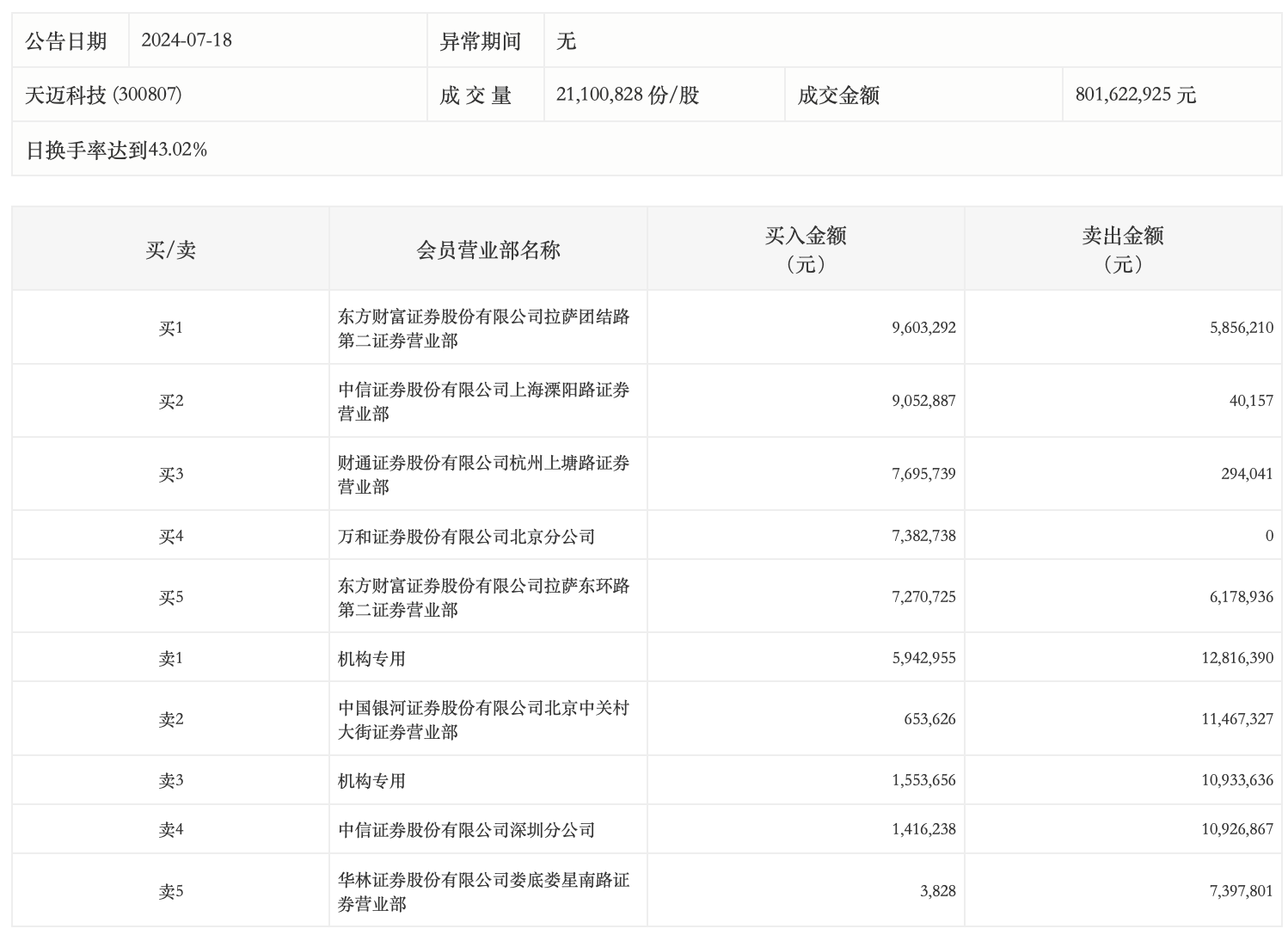 7月18日,天迈科技今日涨停,龙虎榜数据显示,上榜营业部席位全天成交1.16亿元,占当日总成交金额比例为14.53%。其中,买入金额为5057.57万元,卖出金额为6591.14万元,合计净卖出1533.57万元。
