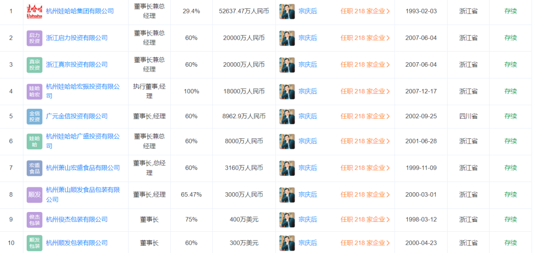此外,宗庆后的家族企业也不止娃哈哈一个集团系列,在娃哈哈集团之外,还有宏盛饮料集团、杭州宗诚集团、浙江真宗集团、杭州三和食品集团等等,分别由宗庆后之女宗馥莉、宗庆后弟弟宗泽后、宗庆后本人、宗庆后弟弟宗端后作为实控人。