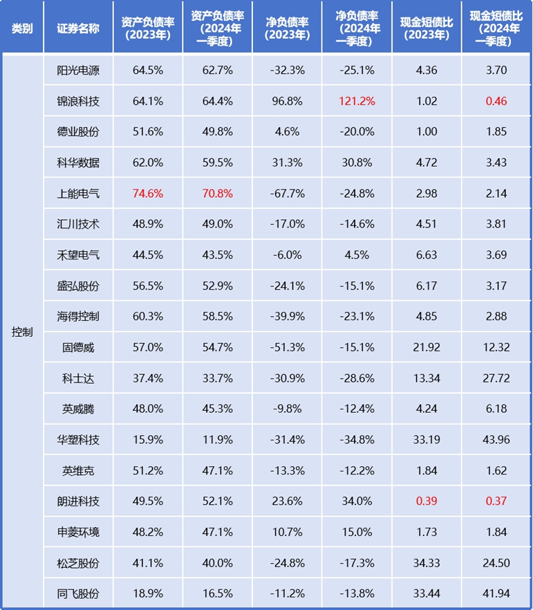 而控制类企业的产品类别多样化,横跨多个功率等级和应用场景,比如光伏和储能,大储、工商业储、户储,集中式、组串式、微逆,不同厂家可能会同时涉及两到三个细分领域。这样“东方不亮西方亮”,行业波动被拉平。反映到资产负债状况上,大部分企业的资产负债率都处于30-60%的制造业合理区间。