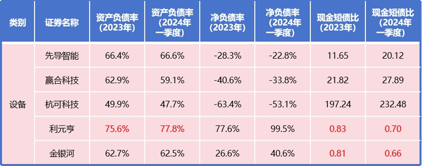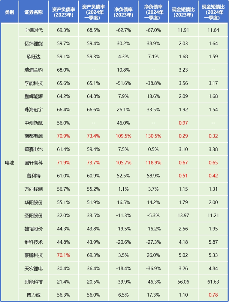 这三条红线分别为:①剔除预收款后的资产负债率超过70%(巨额预收款是地产的行业特点,储能行业的预收款极少,本文不作剔除);②净负债率超过100%;③现金短债比小于1。在赶碳号储能本文中的所有图表中,如果企业的某项指标超出了红线,则用红字进行标示。