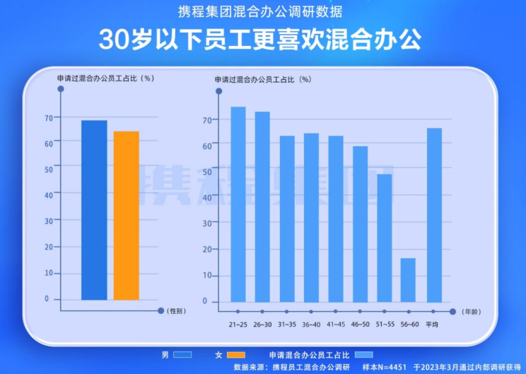 携程方面表示体验过混合办公的比例很高,截至目前,已经有超7成员工申请过混合办公,其中,女性申请人次占比略高,年轻人更青睐混合办公,90后和00后占比近八成。