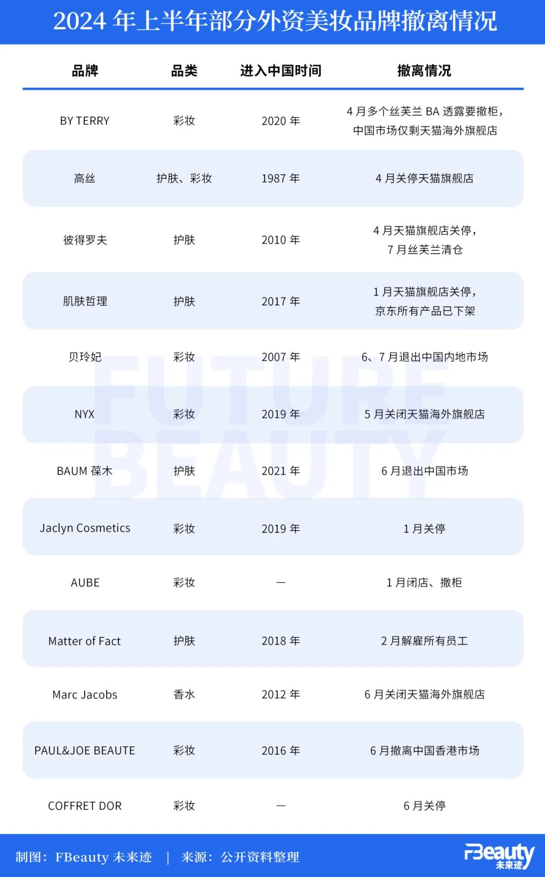 于是我又去看今年上半年外资美妆品牌在中国市场的撤离情况,还真不比国货品牌的情况乐观,关键里面还有许多背靠头部国际集团的品牌,比如资生堂的BAUM葆木、科蒂的肌肤哲理和Marc Jacobs、欧莱雅的NYX、LVMH的贝玲妃等等。