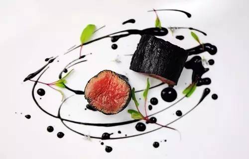 3.平底锅融化黄油,将低温慢煮好的牛柳放入平底锅内,高温煎至表面干爽,一分为二,放入餐具内,再将牛清汤混合墨鱼汁收浓的汤汁淋入餐具内,甜菜苗点缀。