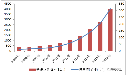 以快递业为例,根据国家邮政局数据,2016年,全国快递服务企业业务量累计完成312.8亿件,同比增长51.4%;业务收入累计完成3974.4亿元,同比增长43.5%。从2007年到2016年,中国的快递业务量增长了超过25倍,快递收入增长超过10倍。