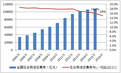 根据中国物流与采购联合会数据,2016年物流总费用约11万亿元,同比增长3%左右,与GDP的比率有望降至15%以内。