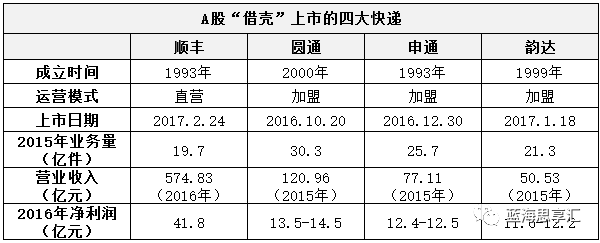 中国快递业务的迅猛发展,正托起为数众多的快递巨头;2016年更是堪称中国快递业的上市年,顺丰、圆通、申通和韵达在A股借壳上市,中通则赴美上市。