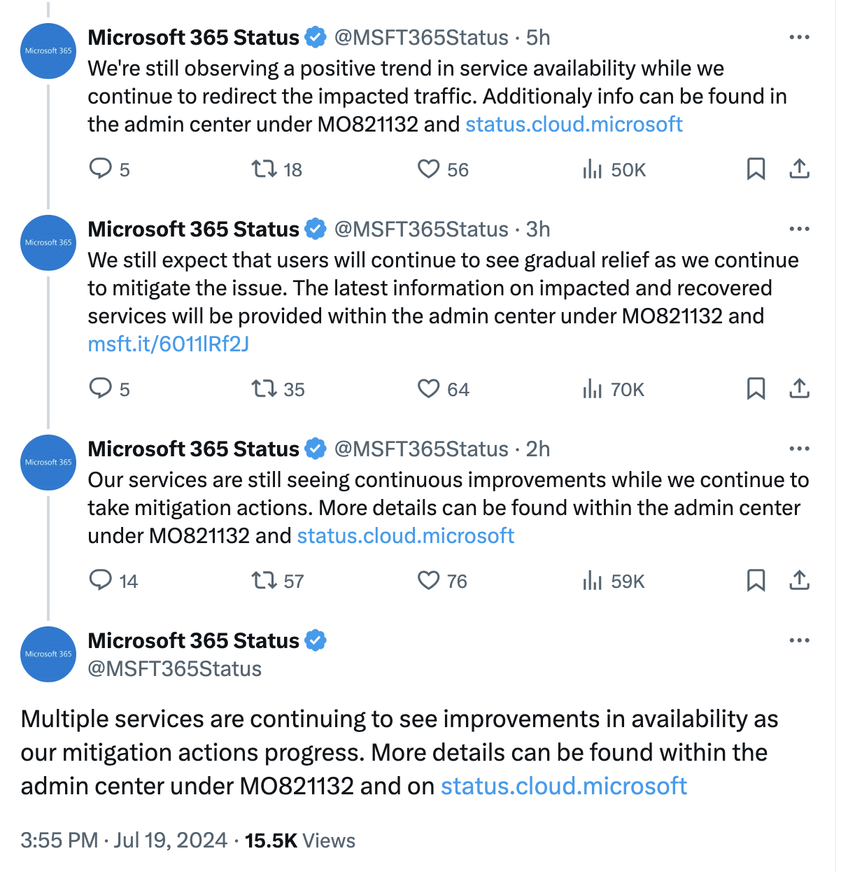 下午15时55分,微软365在“X”上回应称,公司正在采取解决该问题,当前多项服务正在持续恢复。