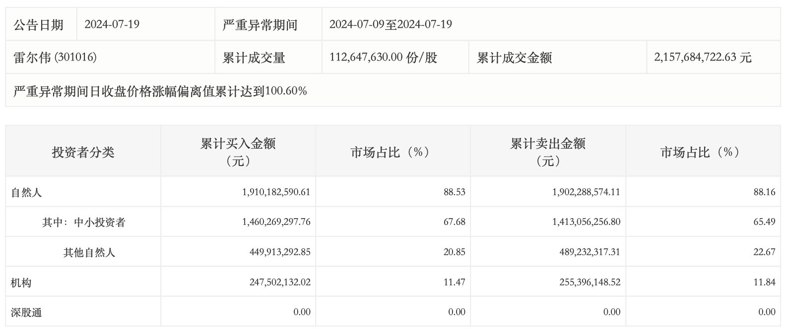 深交所7月19日披露,雷尔伟在7月9日至7月19日期间累计上涨104.8%,涨幅严重异常期间获自然人买入19.10亿元,占比88.53%;其中,中小投资者累计买入14.60亿元,占比67.68%。机构投资者累计买入2.48亿元,占比11.47%。