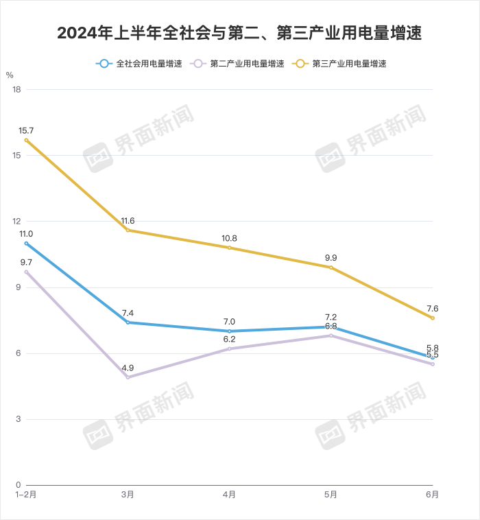 6月,第一、第二和第三产业用电量增速均环比下滑,下降幅度分别为4.9个百分点、1.3个百分点和2.3个百分点。