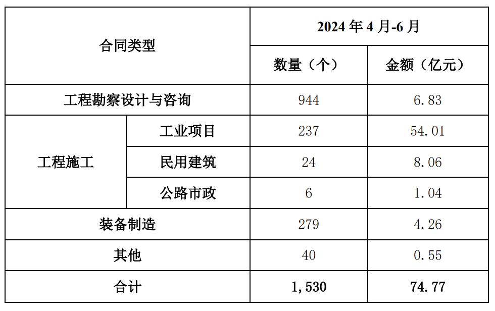 中铝国际7月19日公告,2024年第二季度,公司新签合同金额为74.77亿元,较上年同期降低20.47%。其中工业项目合同较上年同期增加43.73%,民用建筑合同、公路市政合同分别较上年同期降低74.08%、88.16%。截至2024年6月30日,公司未完工合同总额为475.86亿元。