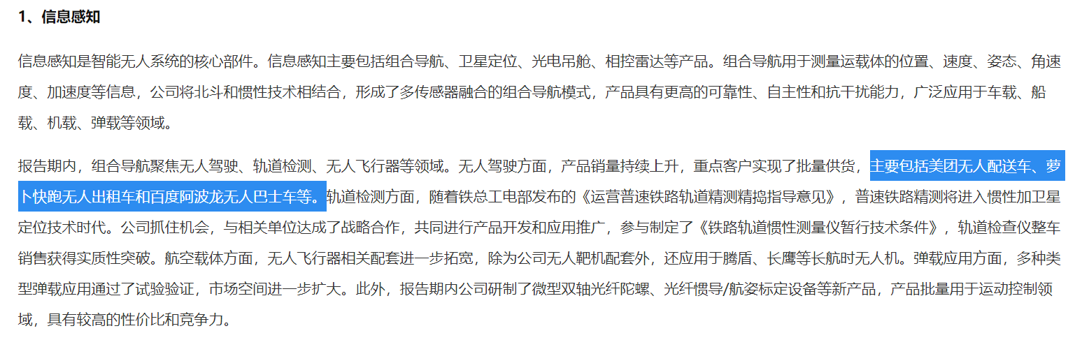 星网宇达早在2021年年报中,就披露了智能驾驶相关业务。公司称,2021年,无人驾驶方面的产品销量持续上升,重点客户实现批量供货,主要包括美团无人配送车、萝卜快跑无人出租车和百度阿波龙无人巴士车等。公司在2023年年报中也表示,公司产品覆盖了惯性导航、光电探测、卫星通信等无人系统核心部件以及无人机、无人车、无人船等无人系统整机。