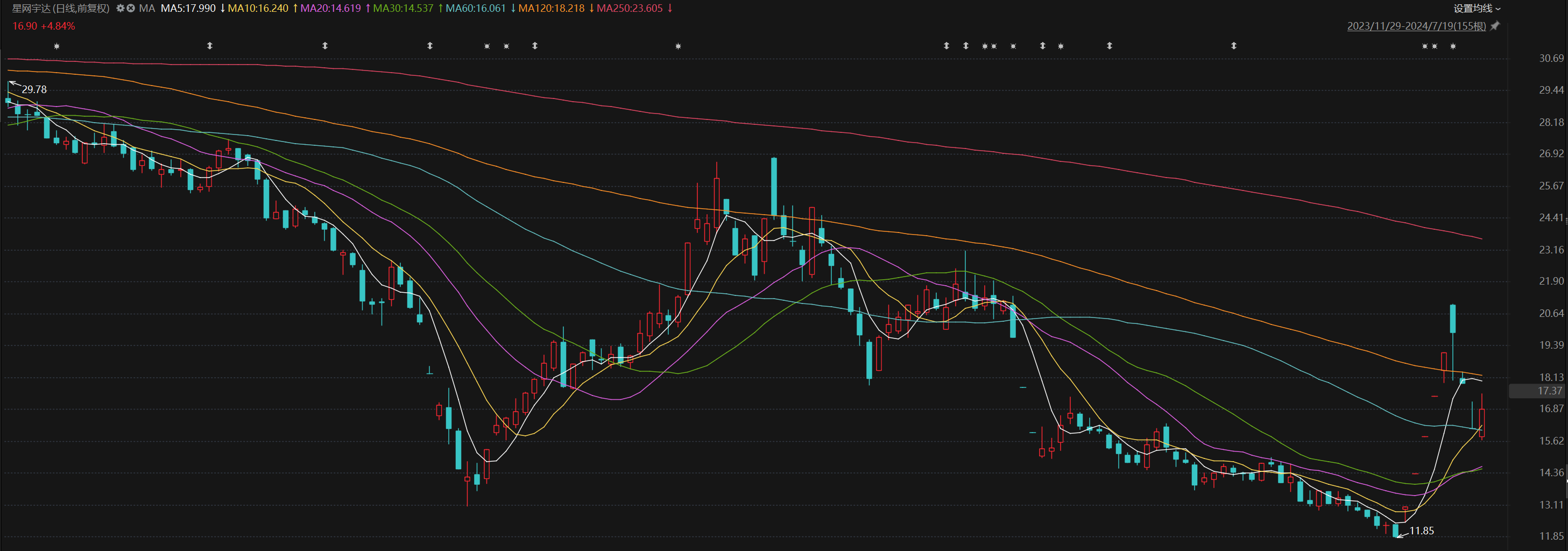 因沾上智能驾驶概念,星网宇达近期股价表现十分活跃。公司股票于7月9日至7月15日连续涨停,达成5连板。随后于7月16日高位巨量放阴后连续2个交易日跌停。7月19日,星网宇达低开后迅速冲高,全天高位震荡,收涨4.84%,报16.9元/股。公司股票全天换手率28.99%,成交额7.03亿元。