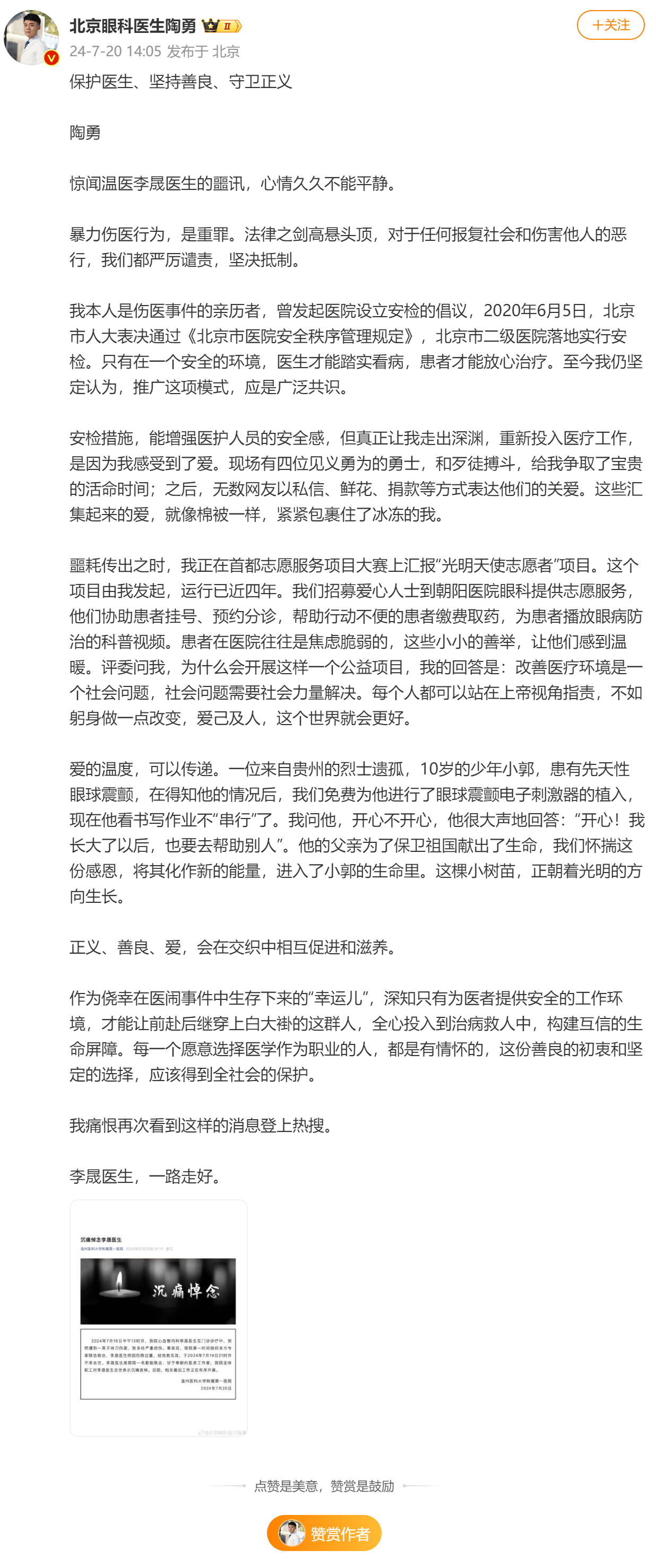 7月20日,曾在2020年遇袭的北京朝阳医院眼科主任医师陶勇在微博上悼念昨日因遭持刀伤害不治身亡的李晟医生。陶勇在文中谴责暴力伤医行为,并提出医院应设立安检。他写道,“我本人是伤医事件的亲历者,曾发起医院设立安检的倡议,2020年6月5日,北京市人大表决通过《北京市医院安全秩序管理规定》,北京市二级医院落地实行安检。只有在一个安全的环境,医生才能踏实看病,患者才能放心治疗。至今我仍坚定认为,推广这项模式,应是广泛共识。”