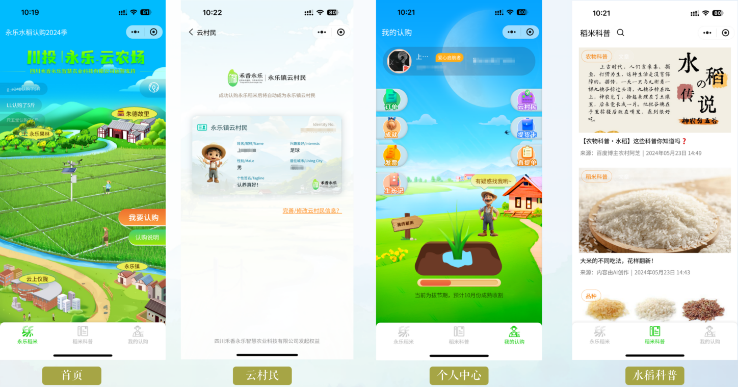 本次上线的“禾香永乐”川投永乐云农场小程序,涵盖农产品认养、线上电商、农事记录、作物长势日志、稻米科普等多元化功能。消费者仅需轻点手机屏幕,即可参与水稻田的在线认养,享受从田间到餐桌的全程可视化追溯服务。此外,小程序还提供了丰富的互动体验,认养者不仅能实时查看作物生长情况,更可亲自前往体验农耕乐趣,感受大自然的宁静与美好。
