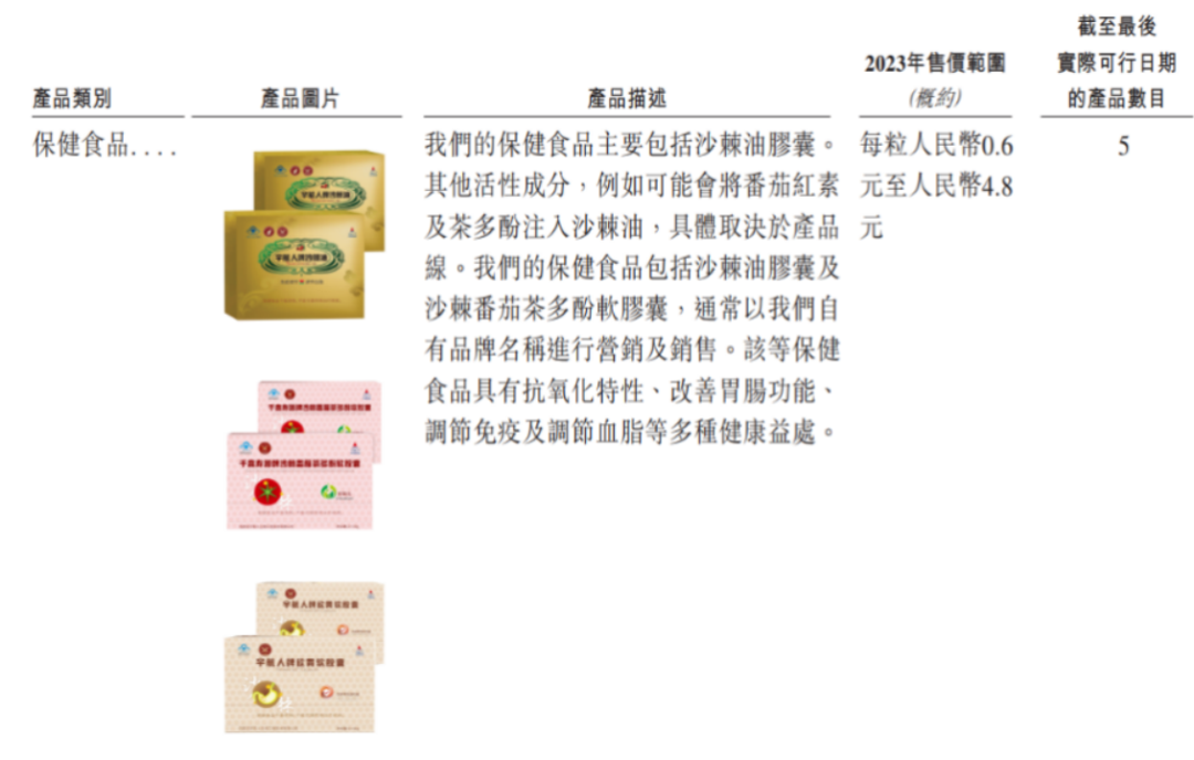 公司第二大收入来源则为保健食品,主要包括沙棘油胶囊及沙棘西红柿茶多酚软胶囊。公司介绍称,这些保健食品不仅具有抗氧化特性,还能改善胃肠功能、调节免疫及调节血脂。报告期内,保健食品带来的收入分别为0.34亿元、0.38亿元和0.6亿元,占比从22.9%提升至27.3%。