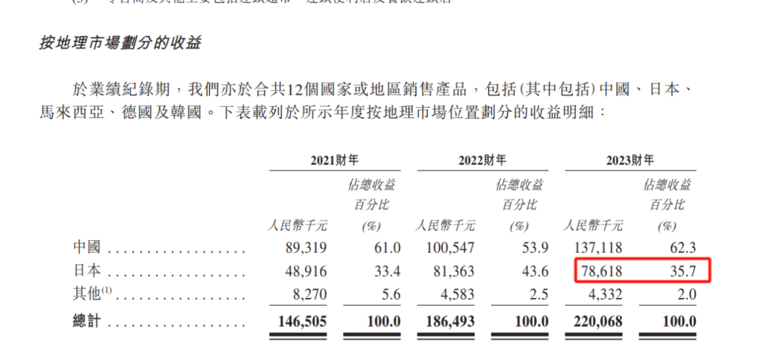在宇航人公司的海外市场中,日本地区是其最重要的市场。2023年,日本市场为公司贡献了约0.79亿元的收入,占公司总收入的35.7%。这一比例与公司从其最大客户“日本宇航人”那里获得的销售收入占比相一致,分别为33.4%、43.6%和35.7%。