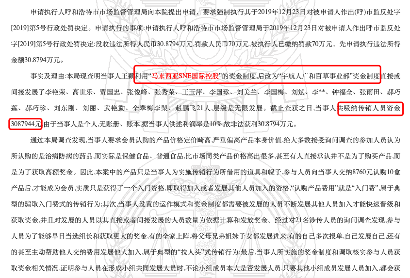 最终,2019年12月23日,呼和浩特市市场监督管理局对王某作出行政处罚,没收违法所得308.79万元并罚款70万元。