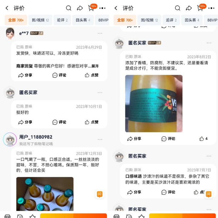 在淘宝宇航人官方旗舰店中,6瓶300ml “宇航人沙棘龙鲜榨果汁”售价49.9元,销量达到2000+。消费者对该款沙棘汁的评价褒贬不一,有消费者认为其酸甜可口,性价比高。也有消费者指出该款产品不是原汁,添加了香精、防腐剂。