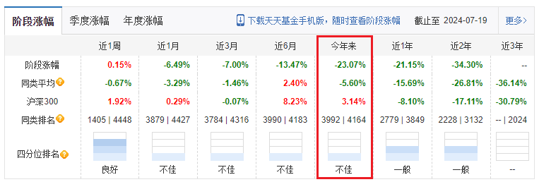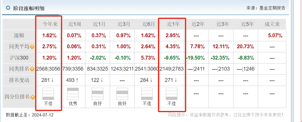 截至7月12日,无论是年内收益排名,还是近1年收益、同类排名都较为靠后。