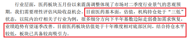 在国联医药消费混合二季报中,基金经理还在给基民吃“安慰剂”,称“目前医药板块估值处于十年维度相对底部区间”。