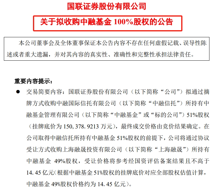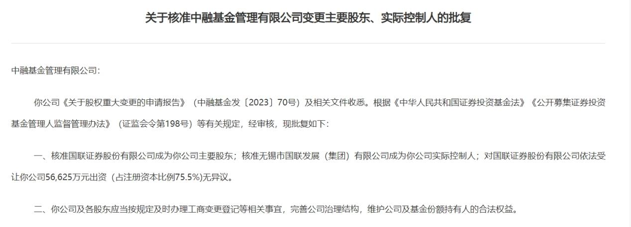 2023年5月,国联证券通过受让中融信托所持全部股权,以及购买上海融晟投资持有的24.5%股权实现对中融基金的控股。