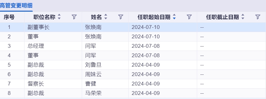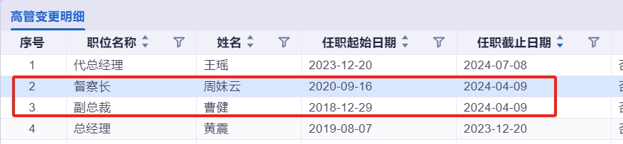 今年4月,督察长周妹云、副总裁曹建职位对调,分别转任副总裁和督察长,而后公司又新任命刘鲁旦和马荣荣两位副总裁。