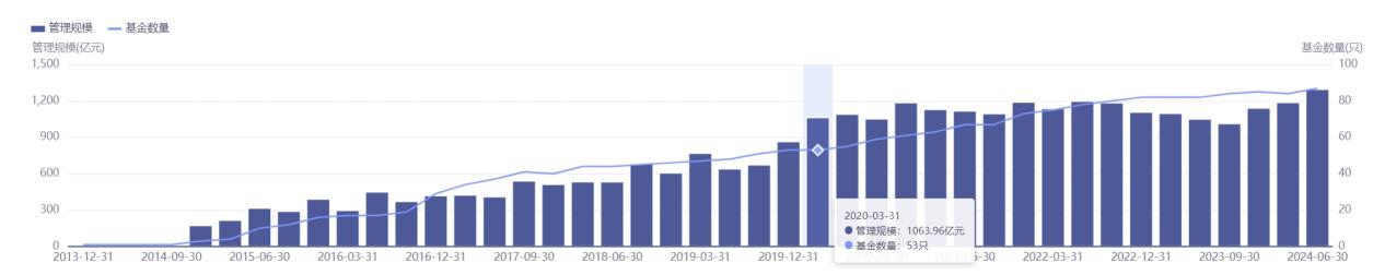 而且,突破千亿元门槛之后,国联基金增速明显放缓,从2020年一季度末的1064亿元增至2024年二季度末的约1297亿元,4年多的时间,规模仅增长233亿元,增速远低于前七年。