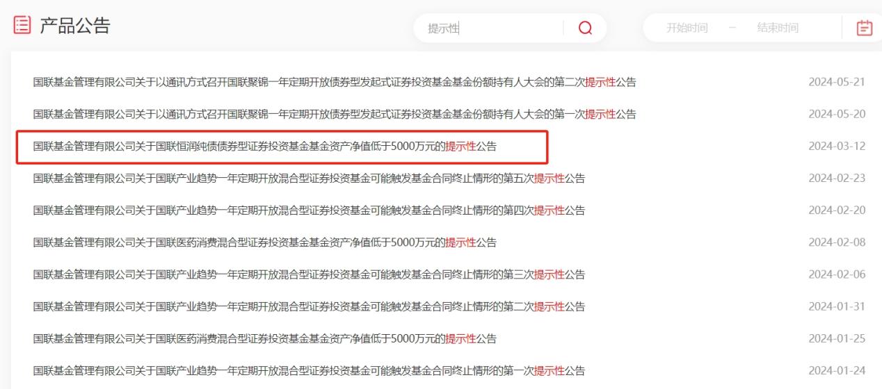 例如在今年3月,国联基金曾发布国联恒润纯债债券基金提示性公告,截至3月11日,该基金资产净值已连续30个交易日低于5000万元。