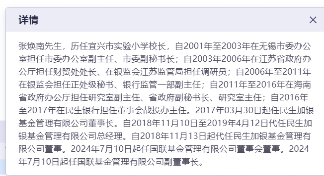 张焕南在进入国联基金之前,曾在民生加银基金担任过董事长、总经理、董事等职务。