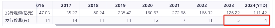 2015年到2022年8年的时间,国联基金每年新基金的发行数量都在10只以上,但2023年,2024年至今,新基金发行分别仅有5只、4只,直接腰斩。