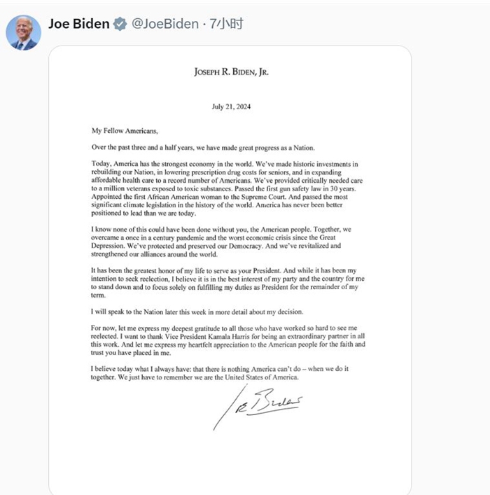 拜登写道:“能作为你们的总统是我一生中最大的荣耀。虽然我一直寻求连任,但为了我的政党和国家的最好利益,我将退选并在剩下的任期中专心履行总统职责。”
