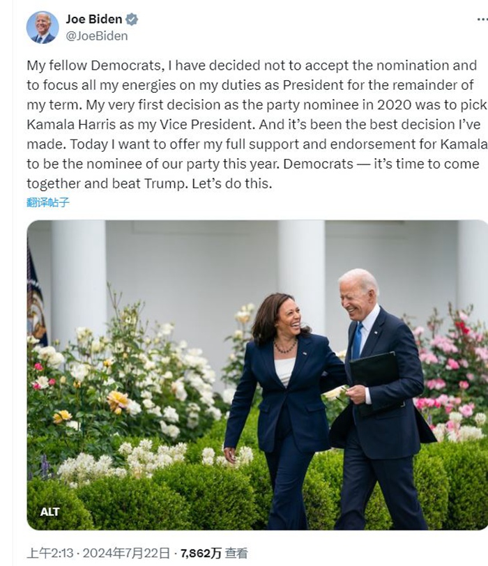在拜登宣布退选后不到1个小时,拜登再次在X平台发文,宣布支持副总统卡马拉·哈里斯成为民主党的总统候选人。