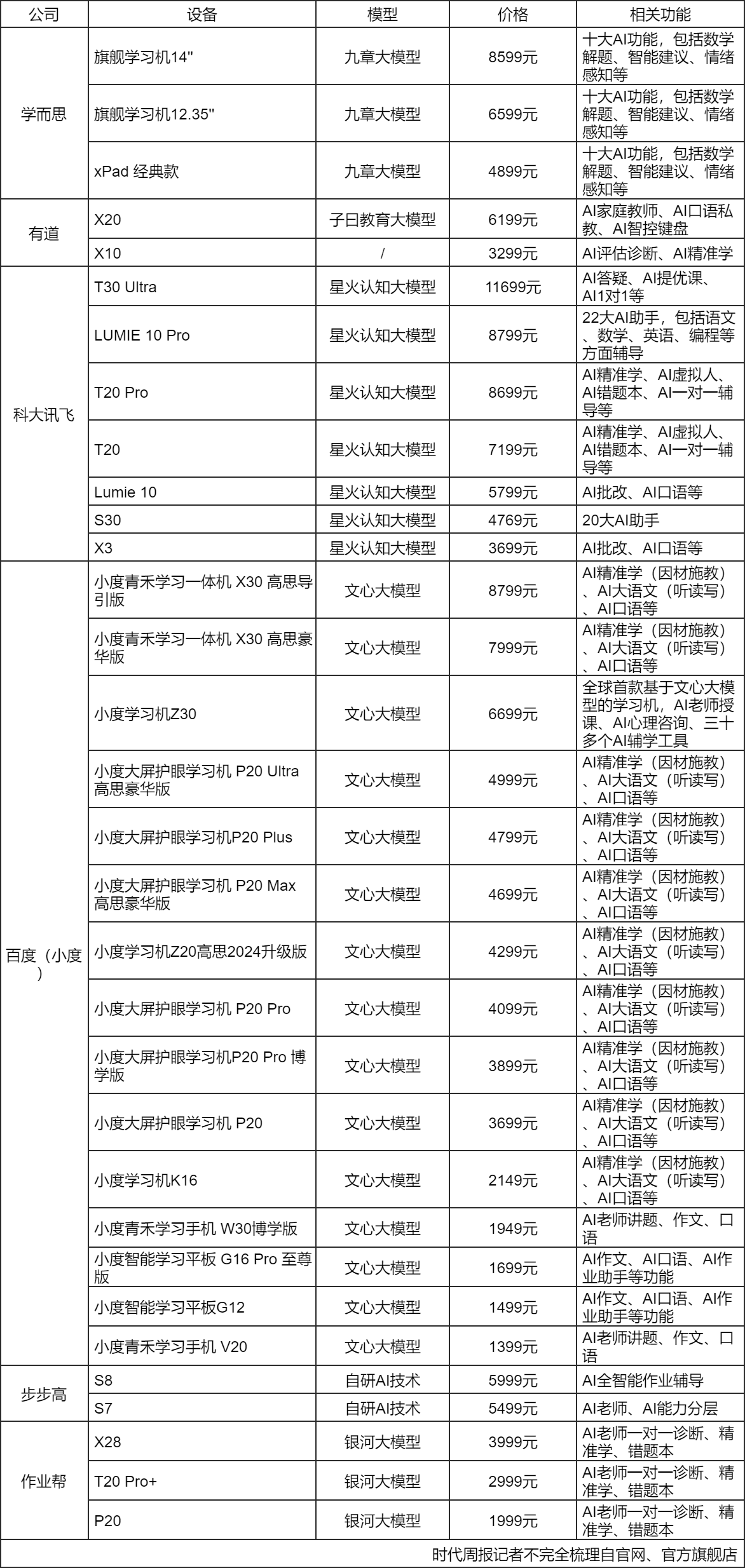 有教培背景的厂商则会重点提及其此前的教育资源积累。当被问及AI功能的优势时,一家学而思门店的销售人员告诉记者“我们的AI功能都是(有经验的)老师和技术人员一起开发的,其他(公司的产品)都没有。”
