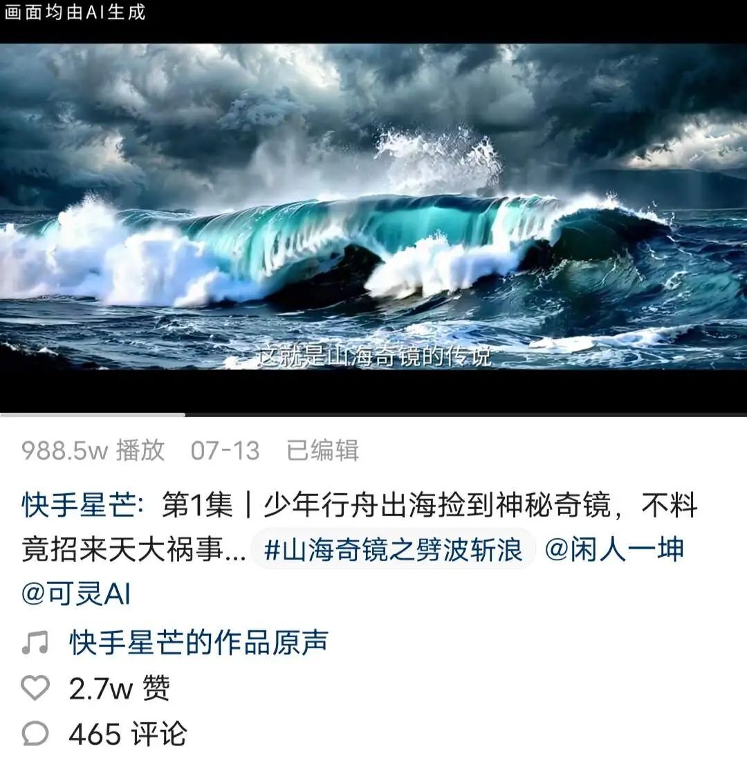 在陪伴观众追剧之外,AIGC也开始进入内容制作的上游环节。这个暑假,抖音、快手推出了各自的首部AIGC短剧:《三星堆:未来启示录》和《山海奇镜之劈波斩浪》,分别选择科幻和奇幻题材,全部镜头均来自AI生成。