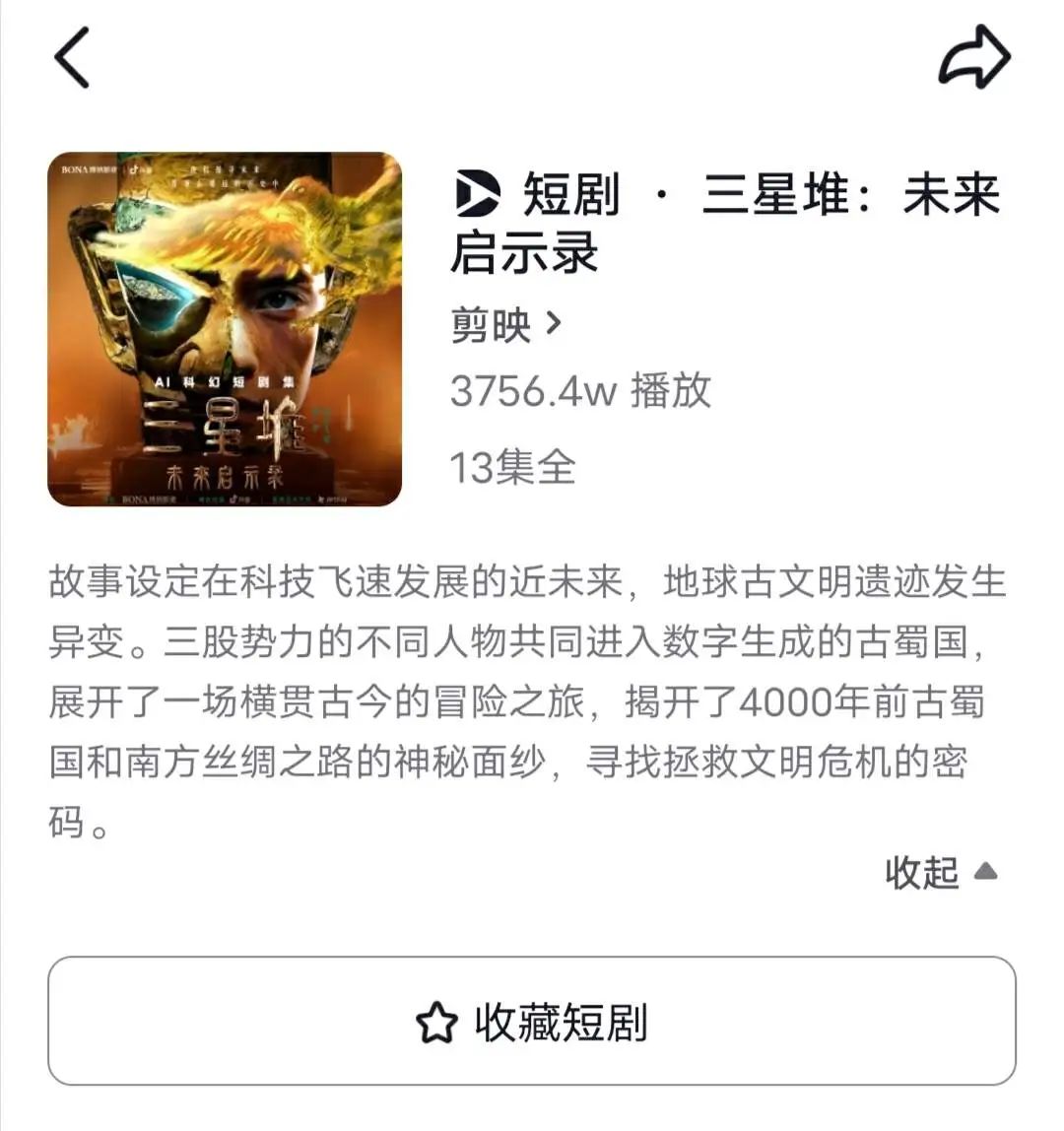 这只是AIGC与影视行业结合的例子之一,除了相对外延的营销手段,AIGC的脚步也开始迈入内容制作的核心环节。这个暑假,抖音和快手分别上线了各自的第一部AIGC短剧:《三星堆:未来启示录》和《山海奇镜之劈波斩浪》。前者是与博纳影业合作,字节跳动旗下AI创作工具即梦AI基于豆包大模型技术,参与剧本创作、概念及分镜设计、图像到视频转换等流程;后者由快手星芒短剧出品,快手自研视频生成大模型可灵提供深度技术支持。