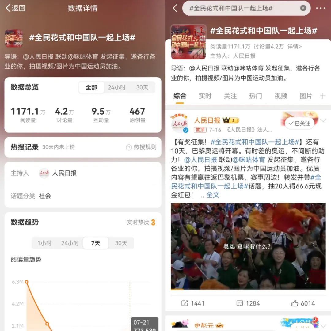 咪咕则更多还是借助和央视等官方媒体的合作渠道,像是携手人民日报新媒体在微博发起#全民花式和中国队一起上场#的征集活动,既提升了平台的权威性,也激发了全民参与奥运的热情。