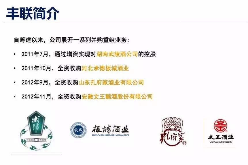 自筹建以来,丰联集团迅速展开了一系列并购重组业务,2011年7月,公司通过增资实现对湖南武陵酒公司的控股;10月,公司全资收购河北承德乾隆醉酒业公司;2012年9月,丰联又全资收购山东孔府家酒业有限公司;同年11月,公司全资收购安徽文王酿酒股份有限公司。