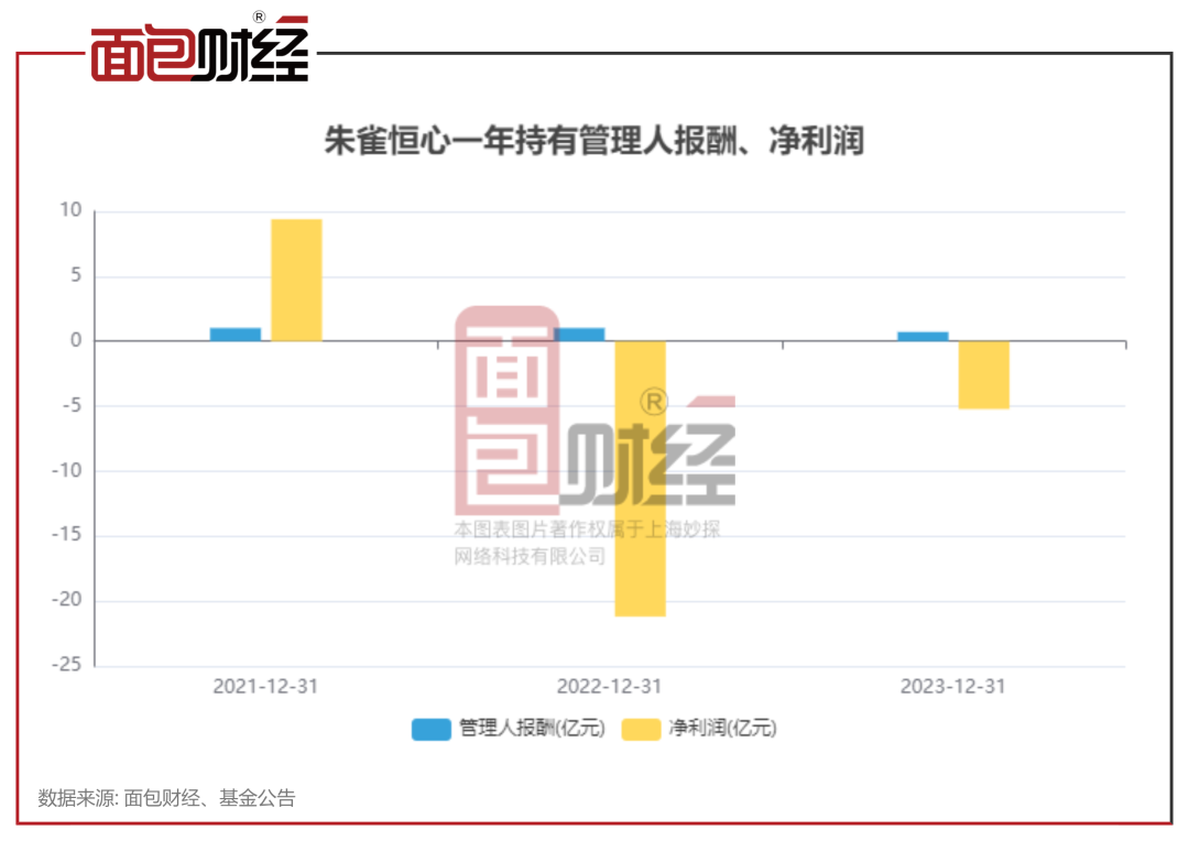 根据基金披露的财报数据,截至2024年上半年末,朱雀恒心一年持有累计亏损超过22亿元。截至2023年末,该基金累计亏损约17亿元,收取管理费约2.75亿元。2024年上半年,该基金亏损约5.41亿元,其中二季度亏损约1.91亿元。