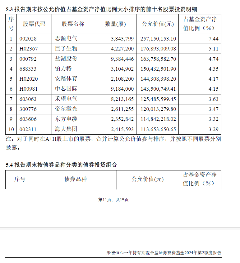 2024年二季度末,朱雀恒心一年持有股票投资金额占基金总资产的比例为77.73%,较上一季度明显上升。