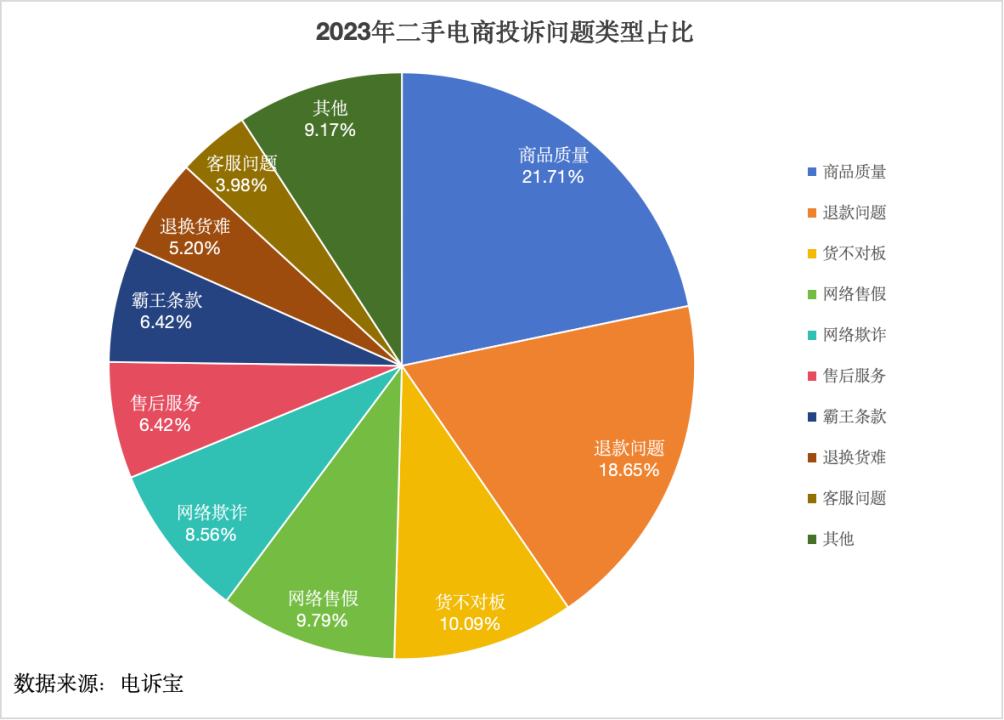 国内网络消费纠纷调解平台“电诉宝”数据显示,2023年二手电商投诉主要集中在商品质量差、退款难以及货不对板等问题上,占比分别为21.71%、18.65%和10.09%,合计超过半数。