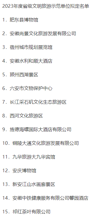 据安徽省文旅厅消息,2023年度省级文明旅游示范单位评定结果已出炉,15家单位达到省级文明旅游示范单位标准。