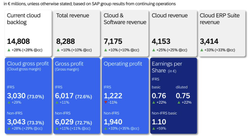 当地时间7月22日,SAP发布2024年第二季度财报。财报显示,按名义汇率和恒定汇率,第二季度总收入82.88亿欧元,同比增长10%;云收入增长25%,得益于云ERP套件收入增长33%;当前待交付云业务为148亿欧元,增长28%。SAP重申2024年财务展望。2025年运营利润目标提高,以反映扩大的转型计划带来的预期效率提升。