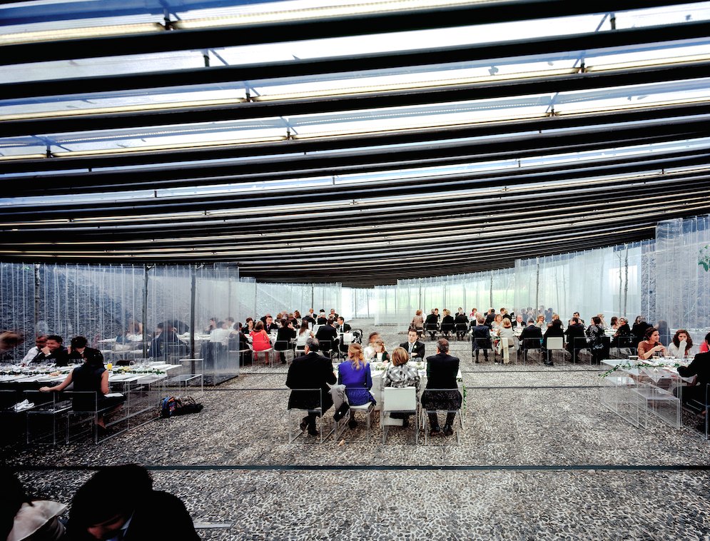2011年的作品帐亭是自然景观与现代极简材料融合的又一案例,它为奥洛特的Les Cols餐厅增添了一个户外就餐和举办活动的空间。这一空间巧妙地融入山谷地形之中,坚固的火山岩墙体支撑着透明轻盈的聚合材料屋顶,防止日晒雨淋,空间内部用来进一步分区的家具和立轴百叶帘同样以透明塑料制成,使人们可以专注于美食、宴饮与自然景观。