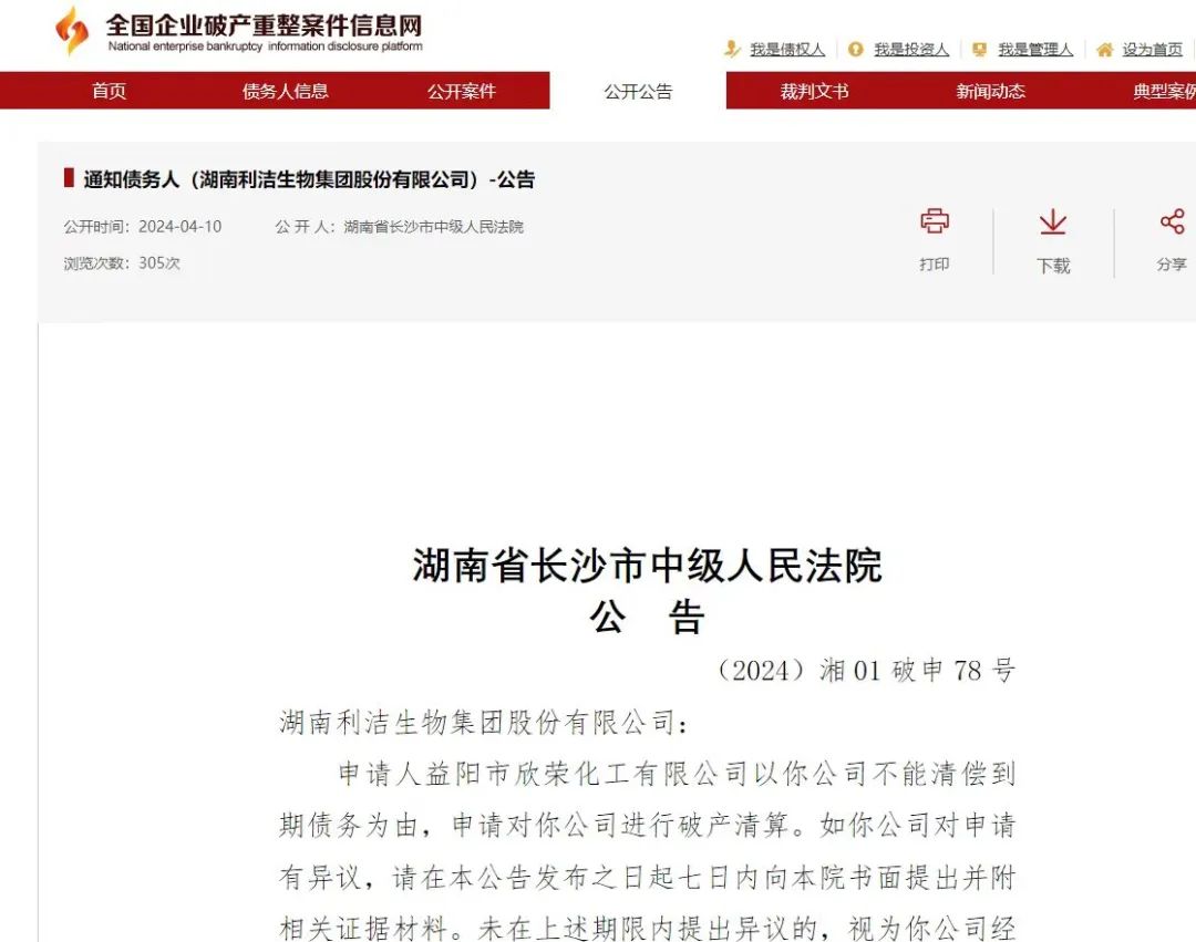 近日,青眼从全国企业破产重组案件信息网获悉,由于不能清偿到期债务,湖南利洁生物集团股份有限公司(下称“利洁”)被益阳市欣荣化工有限公司申请破产清算。