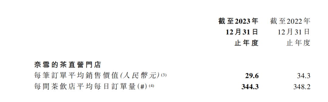 市面上,诸如霸王茶姬、茶百道、沪上阿姨等品牌一杯招牌奶茶的价格大致在17元左右,如果加上优惠券可能会降至12-15元左右,但奈雪中的大部分饮品的价格仍然保持在一杯20元左右,降价的产品也并没有带来销量上的明显提升。2023年,奈雪每间茶饮店平均每日订单量为344.3,相比上年同期的348.2下降了1.12%,再对比直营门店每笔订单平均销售价值的数据,可谓是量价齐跌。