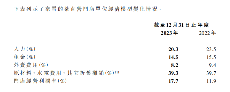 但这个上市以来的首次盈利,是奈雪通过降本实现的。天风证券财报显示,2023年,奈雪单店经营利润率为17.7%,同比增长了5.8%;原材料、水电、其他折摊占比为39.3%,同比下降了0.4%;人力占比为20.3%同比下降3.2%;租金占比同比下降1.0%;外卖费用占比下降了1.2%。