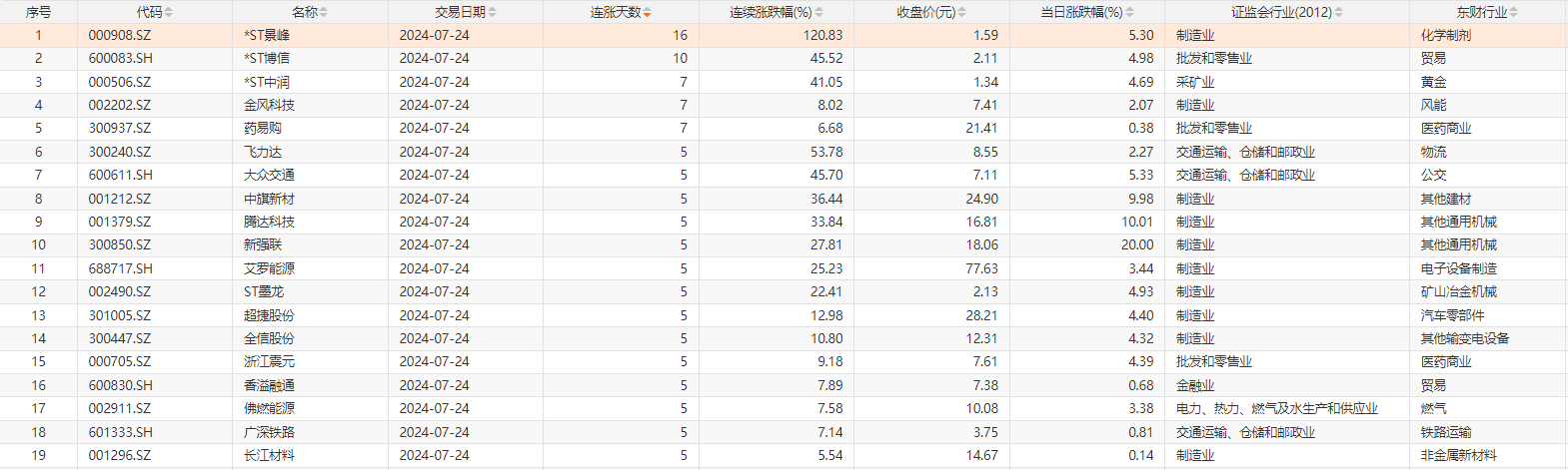 Choice数据统计,今日1只个股连续16天上涨,为*ST景峰;1只个股连续10天上涨,为*ST博信;此外,金风科技、药易购、*ST中润3只个股连续7天上涨;大众交通、飞力达等17只个股连续5天上涨。